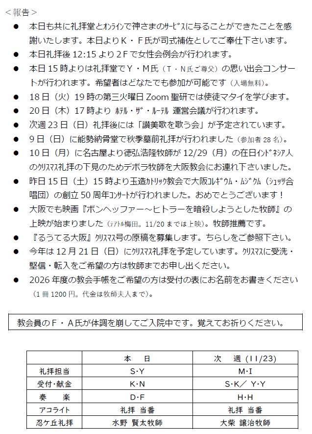 大阪教会からのお知らせ